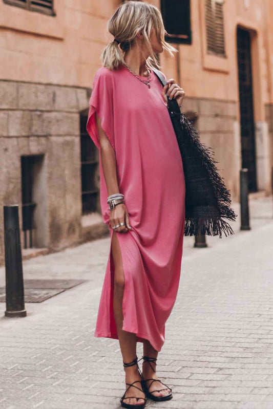 Pink Crew Neck Bat Sleeve Split Maxi T-shirt Dress
